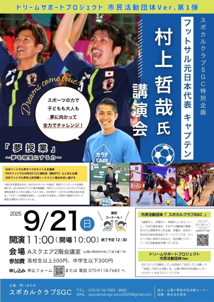 スポカルクラブSGC特別企画 フットサル元日本代表 キャプテン村上哲哉氏 講演会【夢授業~夢を現実にする力~】